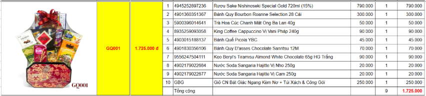 | 10 | Giỏ CN Bát Giác Ngang Kèm Nơ + Túi Xách & Công Gói | GBG |